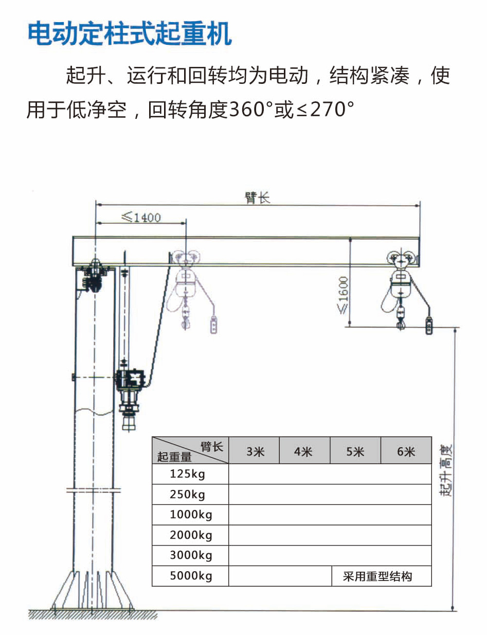 電動(dòng)旋臂起重機(jī)是為適應(yīng)現(xiàn)代化生產(chǎn)而制作的新一代輕型吊裝設(shè)備,配備了可靠性高的JPK型號(hào)