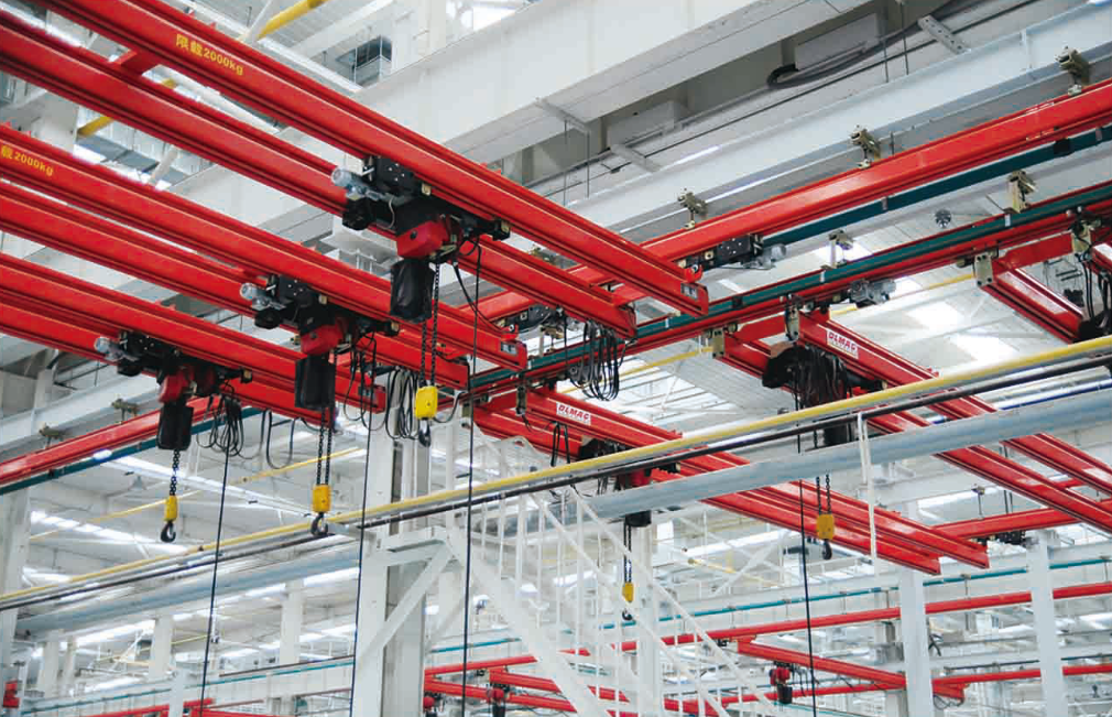 4S柔性雙梁懸掛起重機(jī),是利用標(biāo)準(zhǔn)直線段軌道和其他輔助標(biāo)準(zhǔn)件組合而成,主梁兩端的小車部分,在與主梁方向垂直的兩條平行吊掛4S軌道中運(yùn)行。